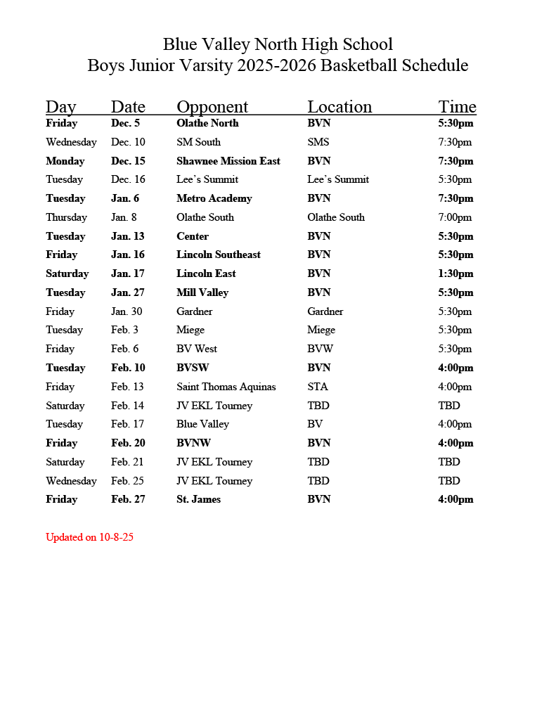 BLUE VALLEY NORTH Boys Basketball 2025-2026 JV Schedule