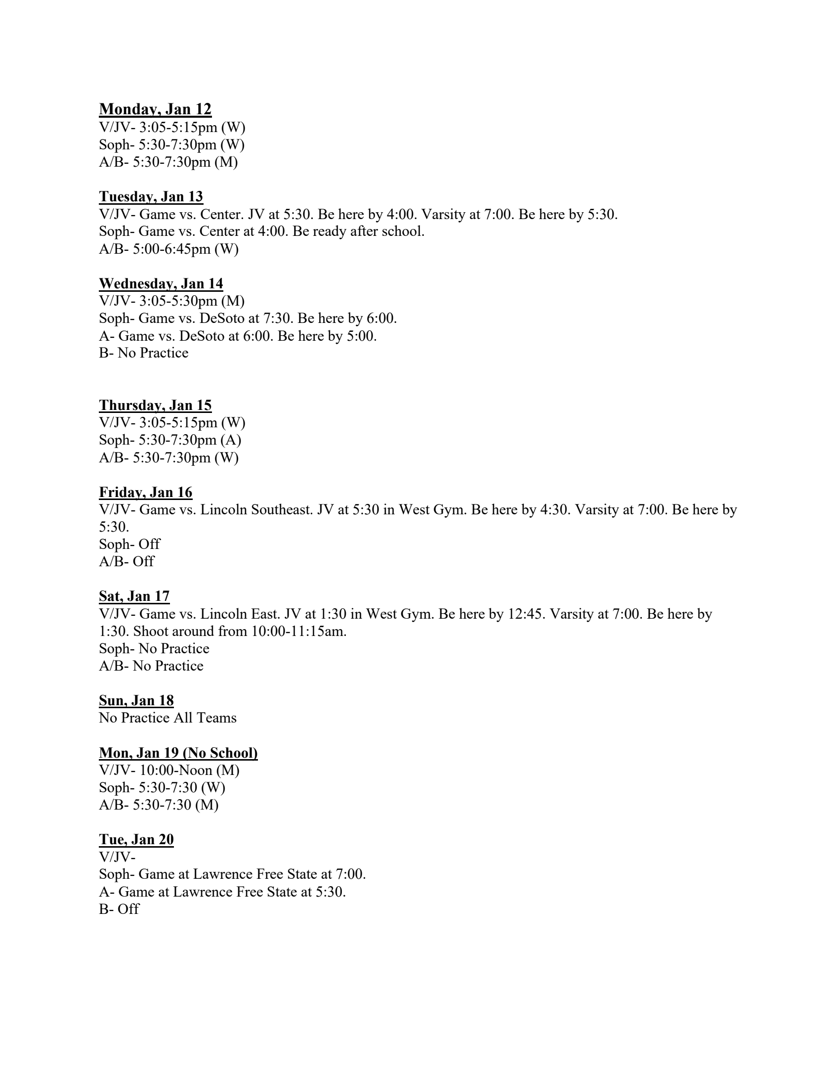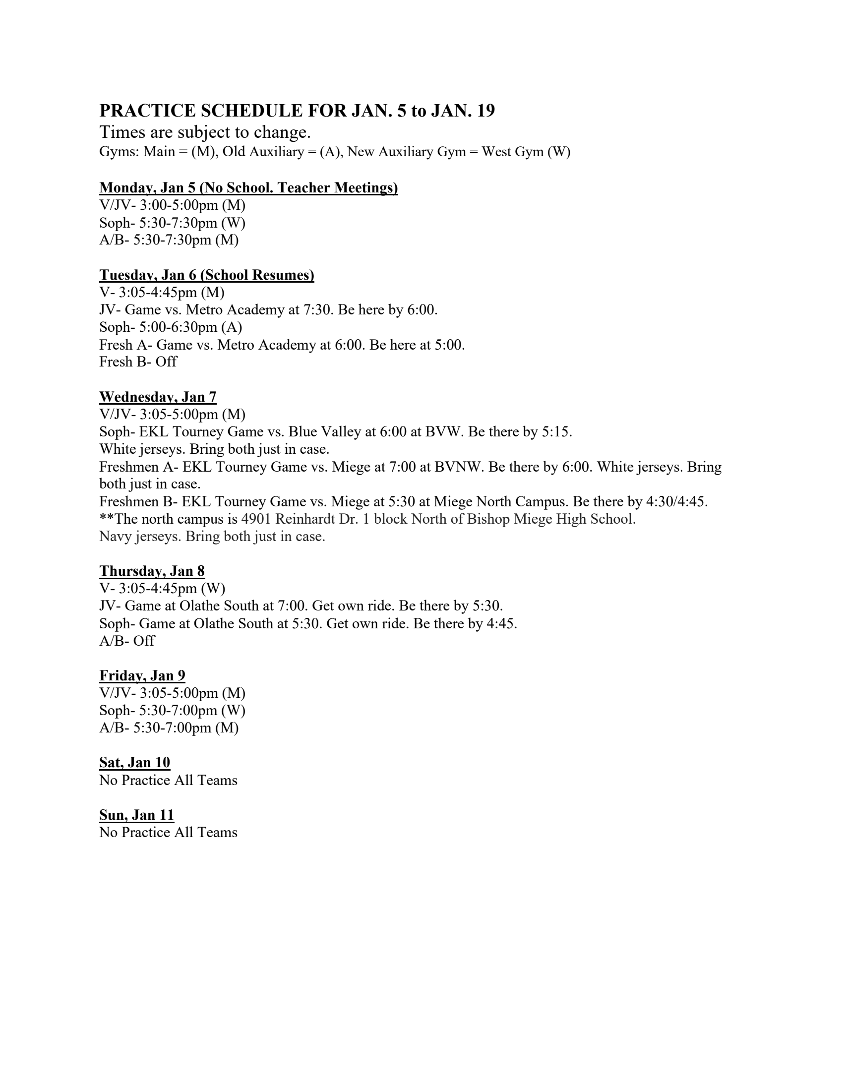 WEEKLY PRACTICE SCHEDULE January 5 - January 24